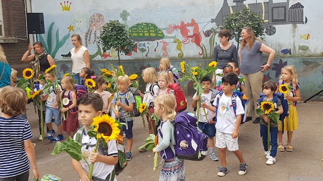 Nach einem von den Drittklässlern gestalteten Gottesdienst, fand die Einschulungsfeier auf dem Schulhof statt. Frau Hinz begrüßte alle Kinder und ihre Familien. Die Ameisen und Wale, die Patenklassen des 3. Schuljahres sangen Lieder und empfingen jedes Kind mit einer Sonnenblume.