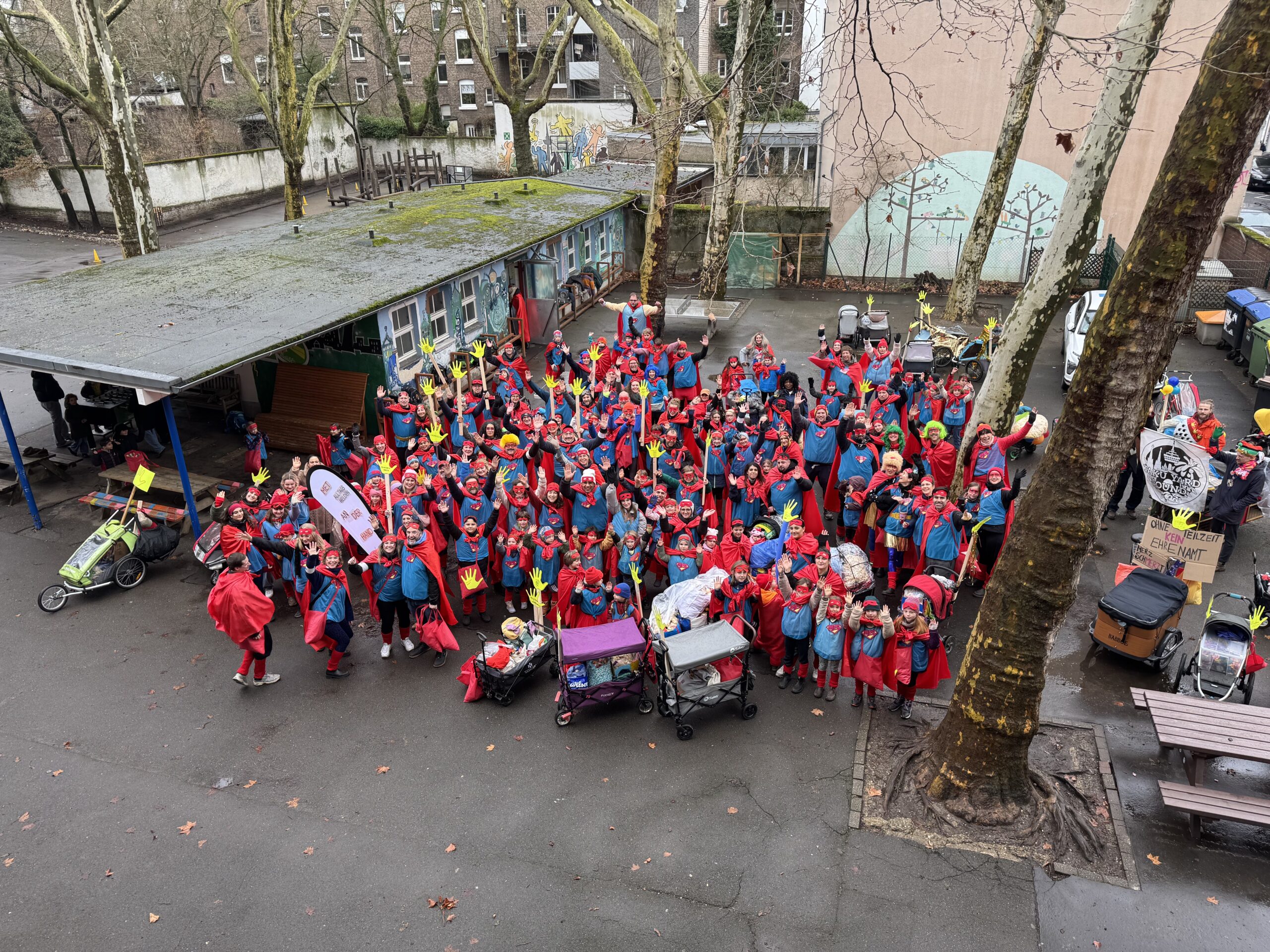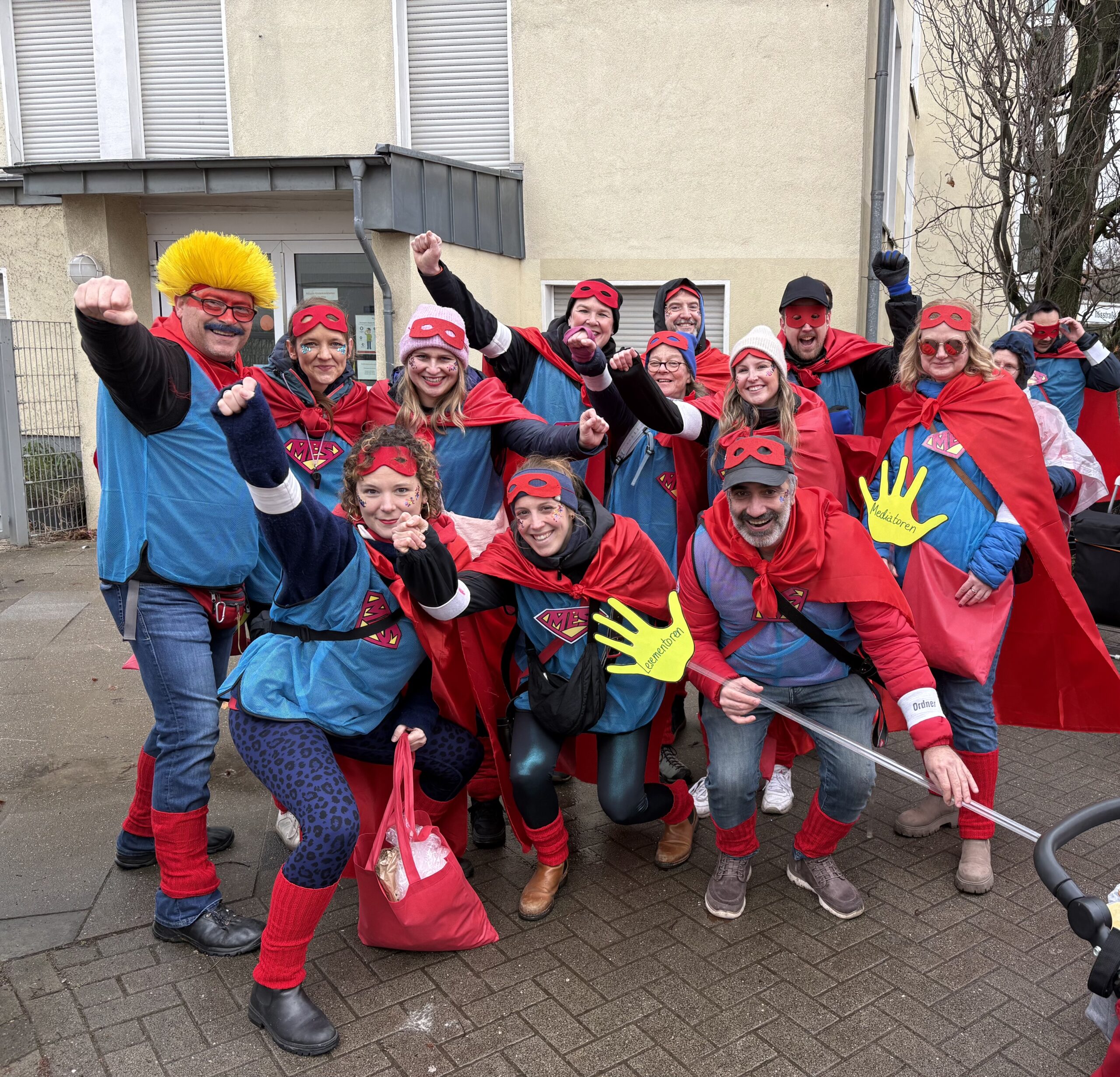 Auch in diesem Jahr waren wir als Schule wieder von Weitem gut zu erkennen. In Anlehnung an das Kölner Sessionsmotto „Alaaf – mer dun et för Kölle“ zeigten alle TeilnehmerInnen im rot-blauen SuperheldInnenkostüm unter unserem Motto „Uns Pänz voran – met Alltagshelden an der Hand“, wie wichtig das ehrenamtlich Engagement an Schulen ist – es macht Bildung ganzheitlicher: fachlich, sozial und menschlich. Es stärkt Kinder und zugleich die gesamte Gesellschaft. Und welche Bühne eignet sich besser, um auf etwas dringend notwendiges auf unterhaltsame und einprägsame Weise aufmerksam zu machen und um die tolle Arbeit unserer (ehrenamtlichen) SuperheldInnen hervorzuheben und wertzuschätzen, als der Kölner Karneval?! Dies ist uns allen an diesem Karnevalsdienstag ganz hervorragend geglückt.